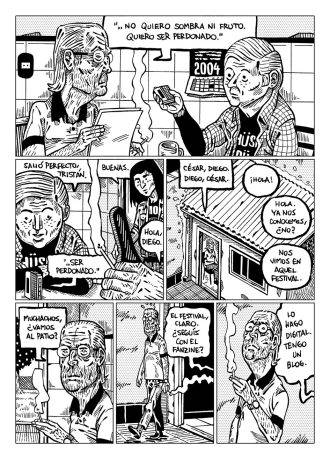 Tras una espera que duró diez años para quienes le echamos el ojo, El Reino de este Mundo despertó gran expectativa, una vez anunciada la novedad. El resultado mantiene el nivel alto y lo lleva un poco más allá, aunque algunas páginas más no hubieran molestado. No digo que le falten tampoco, sólo que podría haber estirado alguna secuencia o capítulo, sólo para lucirse con el dibujo, sin que fuera en desmedro de la narración. Porque uno empatiza y se encariña con estos personajes. No sólo con el binomio de poetas, también con el resto del elenco, que incluye un viejo amor de Tristán (hija incluida), la pareja embarazada de Diego, más una serie de personajes de la comunidad, como Doña Roquelina y Sosita (vecinos de Tristán) o el rector de la universidad. La escena en la que Diego y César, jóvenes punks en 2004, se cruzan en la puerta del almacén con Don Severino Rojas (veterano vecino de la zona) es realmente icónica y uno de los momentos existenciales mejor sintetizados del libro. ¿Y cómo podría faltar Borges en un libro como este, abundante en aristas temporales y encrucijadas? La anécdota verídica sobre su visita a San Luis en 1976, momento crucial en la vida de Tristán por razones no literarias, propicia el capítulo extra con el que el autor completó su novela gráfica. La tapa ciega que oculta el mecanismo de una historieta absolutamente interactiva.