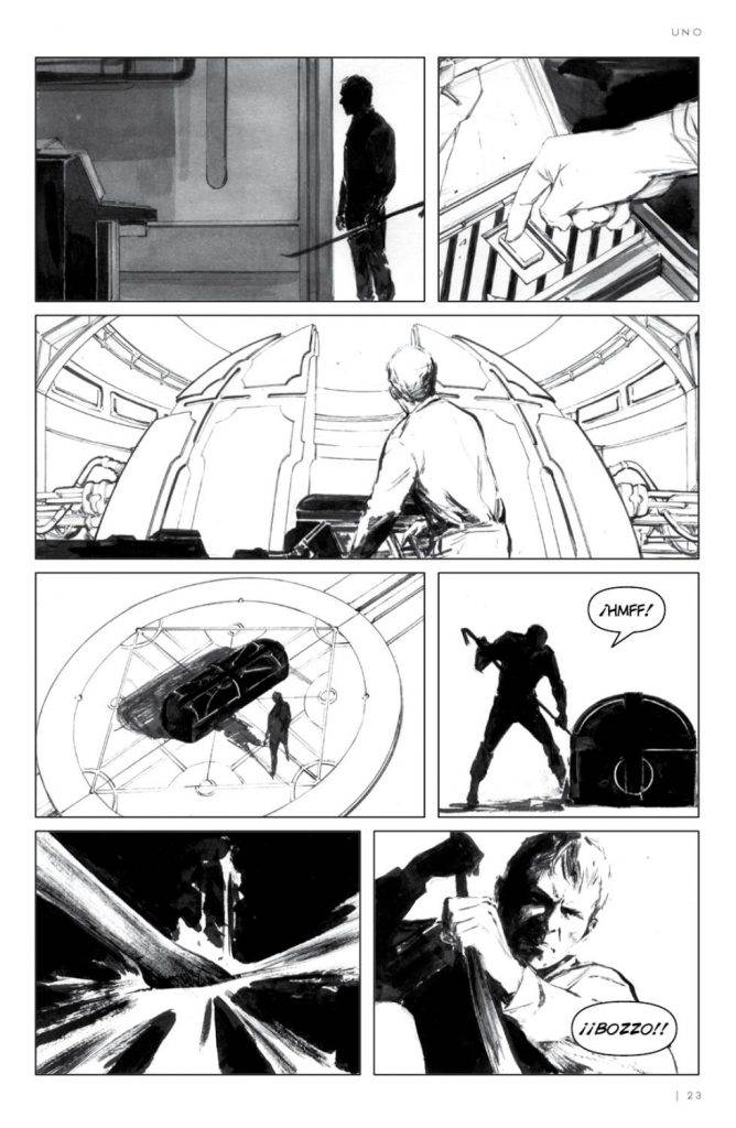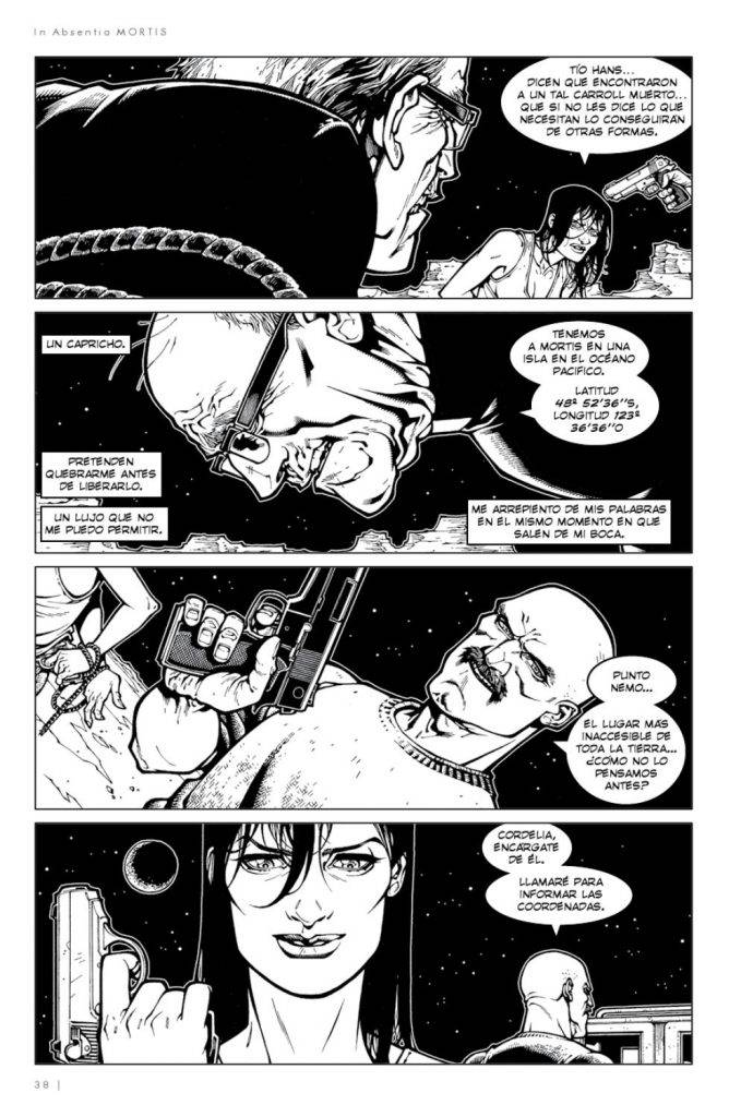 La segunda entrega de la trilogía es llamada “Mortis: Eterno Retorno”. A diferencia del primer tomo, esta novela gráfica está realizada íntegramente por Miguel Ángel Ferrada en los guiones y el dibujante Italo Ahumada, cuyo trabajo me detengo a admirar. Realmente se destaca en este tomo la coherencia grafica que impone página tras página. Su magistral manejo del claroscuro por momentos hace recordar al Viejo Breccia, en otros a al genial dibujante italiano Corrado Roi y por momentos nos remite al Dracula de Gene Colan, pero todo con una impronta personal que hace que la historia se disfrute por partida doble tanto por el guion como por el dibujo. La historia está estructurada en tres capítulos: un preludio, dos interludios y una adenda final. Además de anotaciones ilustradas, la narración cuenta la historia del ritual por medio del cual se quiere traer de vuelta al Siniestro Dr. Mortis.