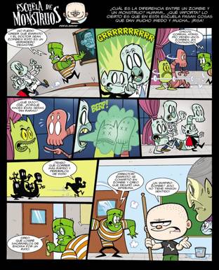EB: Era complicadísimo para mí porque yo, verdaderamente, todavía tenía muchas dificultades. No tenía un estilo absolutamente definido, me costaba. Hoy en día todavía me cuesta mantener o mejorar, tal vez, lo que hago. Pero sí, me dio miedo, en su momento, porque era una oportunidad que si me salía mal no sabía cuándo iba a tener una igual. Por suerte salió bien, llevé la idea de Escuela de Monstruos y les encantó. Pasa todo el verano hasta que se hace el relanzamiento. El primer número es de mediados de febrero, principios de marzo de 2009. En esa época me empiezan a pedir un montón de material… quince o veinte viñetas por número. De Escuela… el primer año fue una página, al segundo año me piden la doble porque a la historieta le estaba yendo bien, y toneladas de viñetas de todo tipo.