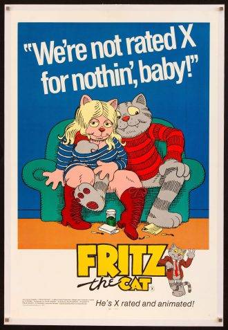 La historieta se convirtió en un boom por su demoledora crítica a la hipocresía de la sociedad moderna de ese entonces, que quedó al desnudo a través de una analogía redonda realizada con animales. Este éxito no pasó desapercibido por el productor, director y guionista Ralph Bashki, quien buscaba debutar en el mercado de los largometrajes de animación. De esta manera, Fritz the Cat no fue solo el primer film de Bashki, sino también la primera animación para adultos y, como si todo eso fuera poco, la única en ostentar la temida calificación “X” al momento de su estreno, en 1972. En el film, Fritz conoce a tres chicas en el parque y las invita a una fiesta descontrolada y los cuatro terminan enfiestados, pero la irrupción de dos cerdos policías, alarmados por el ruido, hace que deban huir.