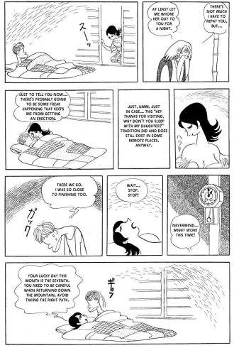 Las ediciones modernas de los mangas de Tezuka suelen venir con una aclaración: unas disculpas de antemano por si alguno se ofende por cómo se retrata a algunas etnias, debido a una cuestión de contexto con la época en que se realizó dicho manga. Y sobre esto habría que hablar al momentos de meternos con Fuusuke, porque el nivel de incorrección que maneja es elevadísimo, pero funciona a la perfección con este tipo de personaje, un incorregible signado por el infortunio que no busca nunca hacer algo bueno con su vida. Sus situaciones son todas escabrosas, hasta perversas por momentos, como la historia donde se encuentra con una mujer que tiene la habilidad de saber el futuro de los hombres cuando éstos la penetran sexualmente. Fuusuke se enamora de ella, se la lleva a la ciudad y prácticamente se la vive cogiendo para saber qué hacer de su vida, qué decisiones tomar. Esto, claro, no es de lo más “incorrecto” que podemos observar, y de nuevo: tengamos en cuenta que son los 70 y estamos en un país tan reprimido y conservador como lo es Japón.