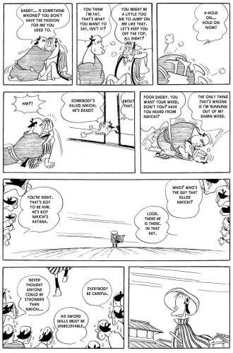 Rareza sobre todo porque Fuusuke se serializó entre 1969 y 1970, en pleno auge de sus historias adultas. Y lo que vemos acá es lisa y llanamente una comedia para adultos, donde el protagonista es un salary-man llamado Fuusuke Shimomura, un vago completamente inútil con aventuras más bien delirantes. Se nota que Tezuka se divirtió bastante durante la realización de estas once historias, porque sin dudas se dedicó a superarse en cuanto más demente o incluso escatológico podía ser. Sin ir más lejos, la primera andanza de Fuusuke comienza cuando él encuentra un pene suelto con vida. Si piensan que más delirio que esto no hay, tengan paciencia porque son once historias sin pies ni cabeza.