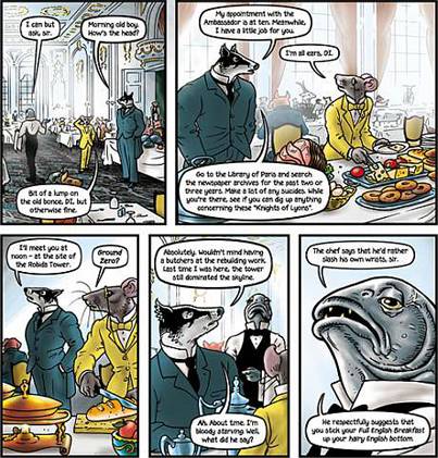 Bryan Talbot es uno de esos autores completos que hacen todo, y lo hacen bien. A la par de una historia bien escrita, llena de referencias culturales bien utilizadas, y personajes bien definidos, Grandville es un comic visualmente hermoso, tanto por la estética steampunk como por el diseño de los personajes y los fondos. Todo se ve hermoso, a la vez que es perfectamente funcional al relato y a la estética elegida.