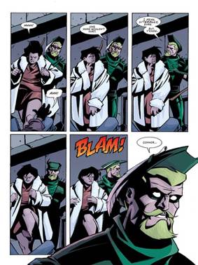 Los nºs 11 y 12 son más tranquilos, con más desarrollo para la relación entre Ollie y Connor, más romance con Black Canary, un brevísimo combate con el Riddler y el inicio del entrenamiento formal de Mia Dearden para convertirse en la nueva Speedy. Y entre los nºs 13 y 15, Kevin Smith narrará su última aventura de Green Arrow, un duro y sangriento combate con un nuevo villano llamado Onomatopoeia, quien dejará a Connor al borde de la muerte. Son los tres números menos hablados de la Era Smith, donde más se lucen los dibujos y los recursos narrativos de Phil Hester.