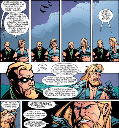 A todo esto me falta decir que Quiver no me parece tan gran cosa. Se trata de una saga estiradísima, que narra en 10 episodios algo que se podía narrar tranquilamente en seis, y para peor el truco al que recurre Smith para traer de nuevo a la vida a Oliver Queen me resulta muy poco convincente. Y sin embargo, la primera lectura de la saga es satisfactoria. El primer número recuenta la historia del Arquero Esmeralda y termina con la confirmación de que Ollie está vivo. El segundo es un episodio muy, muy hablado, en el que nuestro héroe vuelve a la acción con un traje prácticamente idéntico al que le diseñara Neal Adams en los ´60, sin olvidar ni siquiera el antifaz. Para el tercero, Smith empieza a desarrollar a una nueva sidekick para Green Arrow, mientras el héroe resucitado tiene su primer combate posta contra un supervillano, en este caso Black Manta. Esto deriva en un encuentro con Aquaman y en su posterior visita al atalaya de la JLA. Más tarde llegarán los reencuentros con Roy Harper y Black Canary, pero antes habrá un combate con Etrigan, que marcará un poco el rumbo de los cuatro episodios finales: para completar el regreso de Ollie al plano de los vivos falta un elemento de índole mística, y hacia allá encamina Smith el tramo final.