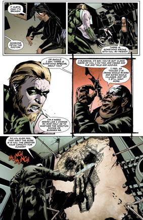 En el nº48, Percy forma equipo con Simon Kudranski (otro al que le gusta más retocar fotos que dibujar) para una de las sagas más extrañas en la larga historia de Green Arrow: Ollie se enfrenta a un licántropo… y es inoculado con un virus que lo convierte a él también en hombre lobo. A ritmo muy lento, la trama atraviesa el nº50, involucra a Deathstroke (en escenas de lucha tremendamente violentas), nos muestra un especie de nave tipo el Blackbird de los X-Men tuneada como si fuera una ”Arrow-Ship” y desemboca en otro conflicto sangriento y despelotado, que se soluciona de un modo absurdamente sencillo, con una tranfusión de sangre de un tipo conocido como Doctor Miracle. Lo mejor que nos deja este arco es que, ahora sí, nuestro héroe recupera la barba posta y no se la va a sacar más. Mirá con qué poco me conformo…