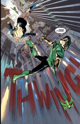 El nº25 (más gordito que los habituales) trae de vuelta a Otto Schmidt, y a la gloriosa Kate Spencer (la Manhunter de Marc Andreyko), acá en el rol de la abogada que logrará sacar a Oliver de la gayola. La trama de corrupción política se va engrosando, Percy pone a los banqueros explícitamente del lado de los malos, Diggle tiene una mini-aventura muy descolgada contra Ra´s al Ghul y hay un nuevo giro impredecible para Moira, la mamá de Oliver. Para los seis números siguientes, Percy sale a robar: como ya lo hicieran otros guionistas en los ´90, arma una saguita (Hard Travelling Hero) en la que Ollie pasa cada episodio en una ciudad distinta, y en cada una se encuentra con un héroe distinto del DCU. Así se suceden team-ups medio al pedo con Flash, Wonder Woman, Superman, Batman y Hal Jordan, hasta que finalmente este último le permite a Green Arrow surcar el espacio exterior (!) y abordar la base espacial del principal villano de la saga, una especie de demonio del que Percy no nos cuenta casi nada, de modo que cuando lo derrotan nos importa menos que la posición de Villa Mitre en la tabla del Torneo Federal A. Emiko y Dinah aparecen de a ratitos, peleando en Star City contra otro villano medio inexplicable, mientras la trama política se va un ratito al freezer. Al final, los muchachos de la Liga de la Justicia le ofrecen el carnet a Ollie, pero este dice ”no, gracias, todo bien. Soy aliado, pero miembro ni a palos”.