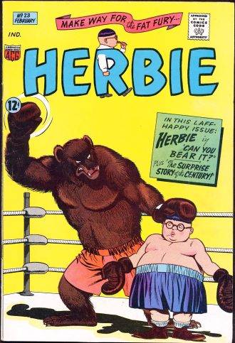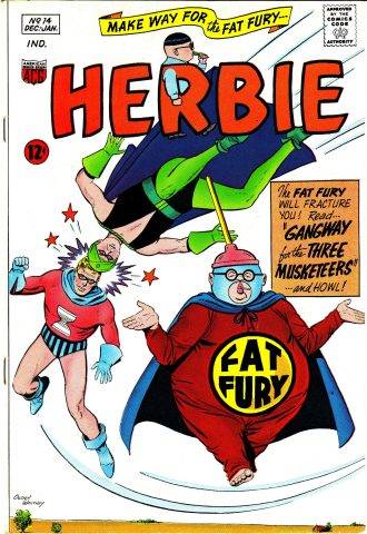 Por supuesto, con todos esos poderes, y teniendo en cuenta el revival de los superhéroes que ocurría en la Silver Age, parecía esperable que Herbie se convirtiera en uno de ellos. Pero Hughes (que públicamente dijo que detestaba el género) lo hizo a su modo. En el nºo 8, ante la aparición de un terrible villano llamado Mr. Horrible, decide intentarlo y se inscribe en la Escuela de Héroes Americanos… donde fracasa, porque no sabe volar como corresponde ni sabe pelear como debe pelear un superhéroe. Eso no impide que se ponga una sopapa en la cabeza, un pijama de franela y un mantel como capa y se convierta en The Fat Fury, para enfrentar y triunfar sobre Mr. Horrible. Esa versión “superheroica” de Herbie tendrá más apariciones, incluido un crossover con los otros dos héroes de la compañía (inventados forzosamente ante la inevitable constatación que los superhéroes vendían): Nemesis y Magicman. Es un crossover hecho en tono de joda, con típica pelea entre héroes incluida, pero nunca es tomada muy en serio.