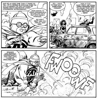 Pero, de hecho, muchas veces son los planes de Pinkus Popnecker, el descerebrado padre de Herbie, los que hacen que su descendencia deba salir a reparar los desaguisados y hacer que todo se arregle para bien. Cosa que el padre nunca registra: siempre cree que son sus geniales ideas las que dan frutos. Sospecho que esta relación “Padre que se cree triunfador que se equivoca todo el rato vs. Hijo super poderoso pero que no quiere demostrarlo” es una de las claves de la identificación de Herbie con los lectores, hartos de que les dijeran “deja esas revistuchas y salí a hacer algo productivo” en sus hogares. La gentil subversión de valores que Hughes les da a sus lectores es uno de las grandes bazas de la serie. Sobre todo si tenemos en cuenta que una historia nos revela que el propio Pinkus era otro gordito bueno para nada idéntico a su hijo hasta llegar a la universidad y solo su interés por conquistar a su esposa hizo que se volviera como es. Pinkus es un “self made man”, uno que prefiere olvidar su pasado y verse como un hombre de mundo cuando, poco a poco, las historias lo revelan como un tonto convencido de su talento. Más subversivo que eso no podés hallar.