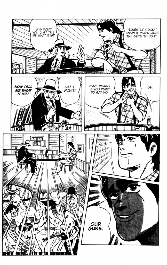 Araki empezó con todo: ganó el máximo galardón otorgado por la Shonen Jump con el unitario Poker Under Arms a finales de 1980. El 5 de Enero de 1981, en el primer número de la Jump de dicho año, debuta formalmente con este western centrado en dos bandidos y una partida de póker, que denota su fanatismo por la cultura occidental. En comparación al resto de su obra, es bastante pobre en muchos sentidos, pero sí muestra algunas cosas que después se cansaría de pulir y perfeccionar. Por supuesto que la historia es lo suficientemente breve como para que no exista un desarrollo o una intención de empatizar con alguno, pero sí vemos a un artista preocupado por el suspenso, por generar un clima que atraiga al lector y que lo obligue a mantener la vista en el manga. El dibujo no es tosco pero sí primigenio. Si uno hace una injusta comparación con las obras por las cuales se conoce mejor al artista, verá un estilo muy simple y poco cargado, más cercano a un Osamu Tezuka que a los delirios referenciales y barrocos que se vieron varios años después. Están esos rostros bellos con interminables cejas, pero en un contexto estilístico distinto en el que no se aprecian demasiado.
