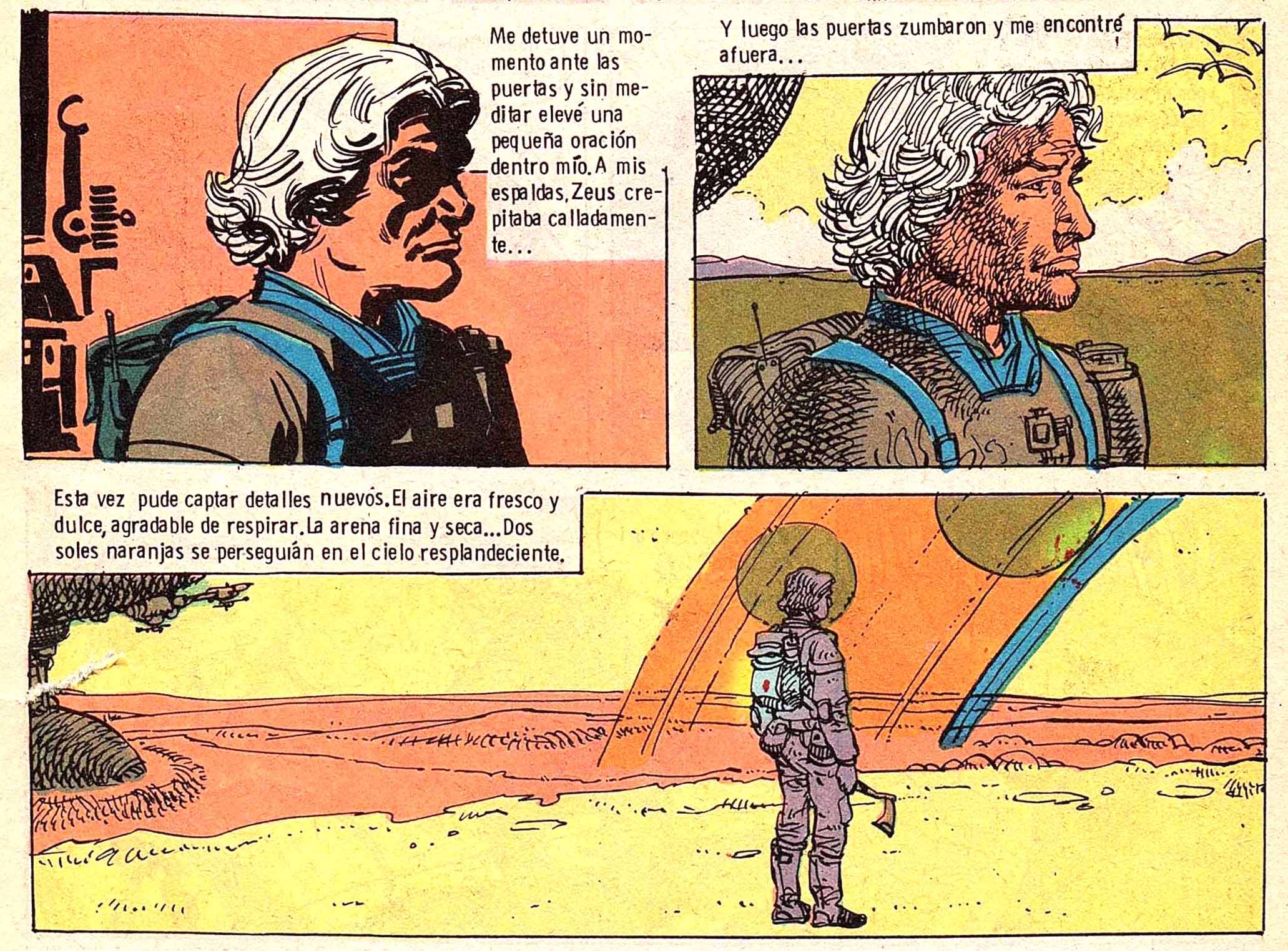 El 2 de Agosto de 1984 sale a la venta la revista D’Artagnan Color 41 -con tapa de Dax empuñando un arma y una mujer a sus pies-, y ahí, sin los bombos y platillos habituales cada vez que Robin estrenaba una serie, aparece el primer episodio de Holbeck. El dibujante elegido fue Alberto ‘Beto’ Macagno, quien por aquel entonces compartía estudio con Cacho Mandrafina y Enrique Breccia, dato no menor, ya que la pluma de estos dos maestros aparecerá en varias oportunidades a lo largo de los episodios de esta serie. Esto es importante para destacar del dibujo, porque se hace muy notoria esa diferencia entre los capítulos y por una influencia de Moebius extremadamente obvia. Quizás toda la obra tiene un tono de ciencia ficción más cercana a la Métal Hurlant que a Flash Gordon, pero recordemos que estamos en 1984 y las revistas de antología reinaban en Europa, casi todas con historias de ci-fi moderna, más introspectiva que aventurera. Está a punto de aparecer el nº1 de Fierro con The Long Tomorrow de Moebius y Dan O’Bannon y acá, Wood y Macagno se van a decantar claramente por esa veta. No faltarán incluso los pterodáctilos arzakianos del genio francés, y ese trasfondo desértico donde puede pasar cualquier cosa, donde la tecnología de punta se mezcla con una prehistoria fantástica. La mayoría de las páginas tienen un diseño de ocho viñetas por página, lo que, sumado a los diálogos típicos de Wood, dejan poco lugar para el lucimiento del dibujante. Lo que hay muy poco son captions: ya estamos en los ‘80s y no están más los poderosos bloques de texto característicos de ese Robin de principios de los ‘70. Este es un Wood más adulto, más experimental, más arriesgado y afilado.