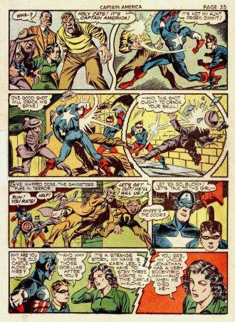 El nº 1 de Captain America Comics fue algo muy raro. Primero, porque era el debut de un personaje 100% nuevo, lo cual habitualmente sucedía dentro de las páginas de alguna revista ya establecida (Batman en Detective Comics), o de una antología en la que aparecían varias historietas de diversas temáticas (Action Comics, el primer hogar de Superman). Sin embargo, este nº 1 traía cuatro historietas completas protagonizadas por el Capitán y su amiguito Bucky (todas a cargo de Joe Simon y Jack Kirby) y recién en las últimas páginas aparecían dos historias muy breves, con otros personajes (The Hurricane y Tuk, the Caveboy). De alguna manera, Martin Goodman y Stan Lee le habían sentido el aroma a éxito a esta creación de la prolífica dupla y decidieron apostar fuerte por este nuevo personaje. Simon y Kirby sabían que otras editoriales podrían pagarles mejor que la humilde Timely, pero Goodman les ofreció un trato inmejorable: 15% de las ganancias y puestos de trabajo fijos en la editorial. La apuesta dio sus frutos: el nº 1 se agotó en pocos días y Goodman fijó la tirada del nº 2 en un millón de ejemplares. Por supuesto, que en la tapa estuviera el héroe encajándole una piña a Adolf Hitler también ayudó bastante.