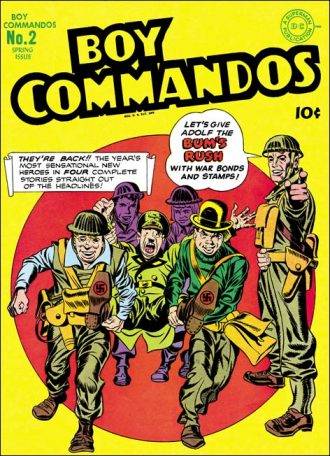 Las historias potentes, con mucho trabajo en los fondos, llenas de figuras dinámicas con músculos imposibles y villanos estrafalarios, se convirtieron en la marca de fábrica de Simon y Kirby, y su reputación no paraba de crecer. Cuando en 1942 desembarcan en la hoy DC, lo hacen con un status de estrellas, de capos que vienen a levantar series alicaídas y a crear nuevos hitazos. Y así fue: enseguida le cambiaron la cara a Sandman, al que vistieron con un traje más superheroico y dotaron de un compañerito al estilo de Robin y Bucky. Otro héroe que generaba poco interés en las páginas de la revista Adventure Comics era Manhunter, a quien también la dupla le pegó una refrescada. Y en materia de creaciones originales, durante ese mismo 1942 aportaron a la Newsboy Legion (los chicos del barrio que vivían aventuras junto al héroe llamado Guardian) y más tarde a los Boy Commandos, una atractiva combinación entre la pandilla de chicos y el género bélico.