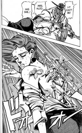Antes, había mencionado brevemente las líneas de fuerza y cómo se incrustan en la viñeta. En JoJo, a partir del Arco 3, las líneas de fuerza cobran vida, son una Stand en sí misma. En el Arco 4, a sátira y permanencia de esto, Rohan Kishibe es introducido como un personaje cuya narrativa es una Stand, llamada Heaven’s Door.