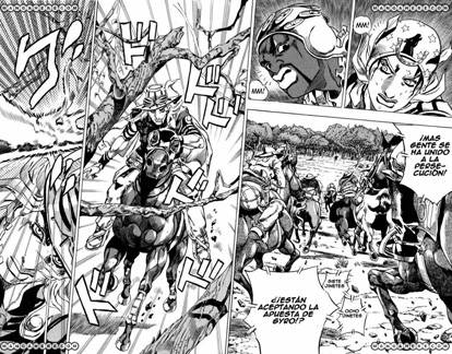 Mucha gente llegó a conocer JoJo’s Bizarre Adventure con la nueva serie animada que salió en la televisión abierta, fiel al manga que lo gestó; otros lo conocieron por las OVAs que salieron antes de la serie. Yo soy fiel lectora del manga de hace un par de años y recién estoy empezando a ver la animación televisiva que va por el cuarto arco Diamond is Unbreakable. Y como sostengo que el manga y el anime son categorías que dan para hablar en sí mismas en términos tanto artísticos como de narrativa (sumando el detalle del trabajo de storyboard), voy a referirme exclusivamente al manga en esta nota, dejando una puerta abierta para hablar del animé, evitando dar “spoilers” importantes de la trama para que el lector pueda aventurarse por sí mismo a disfrutar de la historieta. Pero en JoJo´s eso es casi imposible, por cuestiones que veremos más adelante.