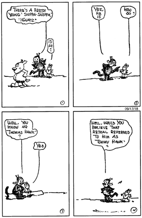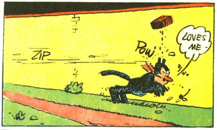 La historia particular de Krazy Kat arranca, como dijimos, con la vuelta de Herriman a Nueva York, traído por Hearst para trabajar en su New York Journal. En la tira de The Dingbat family del 26 de julio de 1910, Herriman incluye una pequeña historia paralela a la principal en la que un ratón le arroja una pelota a un gato. El autor se encariña tanto con estos personajitos que, lentamente, la parte inferior de su espacio se transforma en una sub-tira. Allí, estos primerizos Krazy e Ignatz ganan su propio lugar para hacer sus travesuras. En sus comienzos, la premisa argumental de la tira es muy simple: Ignatz es un ratón cuyo único objetivo en la vida es asestarle a Krazy un ladrillazo (o cualquier otro objeto contundente) en el marote. Krazy se pasa el día filosofando y haciendo poemas sobre la belleza del universo hasta el momento en que el ladrillo impacta en su cabeza. Este planteo, similar al de la comedia de pastelazos o slapstick, encuentra muy pronto sus limitaciones, y poco a poco Herriman se ve obligado a incorporar nuevos personajes a la tira, que la van enriqueciendo sin despegarse nunca de la premisa original. Uno de ellos el Bull Pupp, un perro bulldog que con el correr de las tiras se transformaría en el Ofissa Pupp, el policía que lleva prisionero a Ignatz cada vez que lo descubre en sus prácticas de tiro al blanco con Krazy. En estos primeros comics, el estilo gráfico de Herriman aún es muy esquemático y contrasta fuertemente con el mucho más detallista de The Dingbat family (por ese entonces ya rebautizada como The Family Upstairs), sobre todo si vemos las dos tiras una debajo de la otra tal como se publicaban en el Journal.
