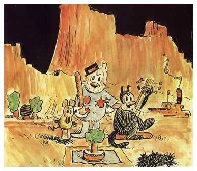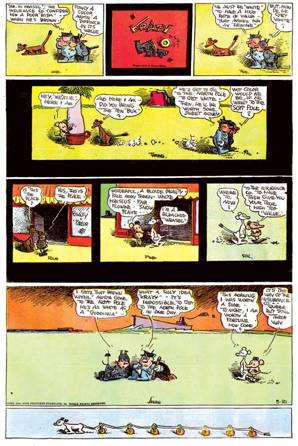 Krazy Kat empieza a ganar popularidad entre los lectores y en 1916 genera una serie de cortometrajes basados en sus tiras. Ni lerdo ni perezoso, William Hearst le ofrece a Herriman una página completa para seguir dándole vida al mundo de Coconino. La primera página dominical de Krazy Kat aparece el 23 de abril de 1916 en el suplemento “Arts & Scene”, logrando que la serie aumente notablemente su calidad y repercusión. Al contar con más espacio y dirigirse a un público más amplio, Herriman tiene el campo libre para desarrollar historias más innovadoras y experimentales desde lo artístico, que alimentan la vida interior de la serie. Hearst se entusiasma tanto con esta nueva versión de Krazy Kat que, además de ordenarle un aumento de sueldo –rechazado por Herriman con la insólita justificación de que la tira le insume muy poco tiempo de elaboración-, le ofrece un contrato de por vida con el King Features Syndicate. Esto le garantizaría la publicación de sus historietas sin preocuparse por cuestiones económicas. De nuevo instalado en California, George aprovecha para realizar reiterados viajes a Arizona, en busca de planicies que lo inspiren para la serie. A partir de ese momento comienza a incluir paisajes de Monument Valley y diseños provenientes de la cultura mexicana y los indios navajos.