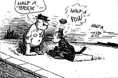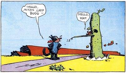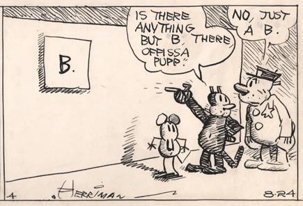 En cuanto a Ignatz, sus tentativas por llamar la atención de Krazy y su constante desafío a la autoridad de Pupp lo muestran en un intento por superar su complejo de inferioridad –además de ser, narrativamente, el principal motor de los gags de la serie. Por último, Offissa Pupp está impelido casi ciegamente a cumplir con la ley y el orden, cosa que lo vuelve un inepto y un incentivo para las travesuras de Ignatz. Detesta profundamente al ratón, al punto de buscar cualquier excusa para meterlo en la cárcel, y también ama a Krazy, pero con un cariño más bien paternalista. Vale aclarar que este “triángulo de amor bizarro” muy pocas veces aparece en la serie de manera explícita y está regido por las reglas propias de Coconino County. Allí la racionalidad y las leyes de la lógica son alteradas constantemente, y el amor y el odio entre las personas no se manifiesta de la misma manera que en el mundo real (a tal punto que un ladrillazo en la cabeza puede ser considerado un gesto de cariño). Es probable que Herriman se divirtiese con estas polémicas y buscara potenciar la ambigüedad de sus personajes para mostrarnos la simpleza del mundo de Coconino en contraste con la complejidad del nuestro. En una tira de 1915, Krazy se pregunta “no sé si debería tener un marido o una esposa”, a lo que Ignatz responde “ten cuidado”, mientras le arroja uno de sus habituales ladrillos.