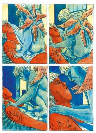 En la primera viñeta hace su aparición una figura demoniaca, con dientes afilados que nos deja completamente perplejes. Continuamos recorriendo la página y nos damos cuenta que se trata de una personaje absolutamente fantástico y onírico. Se trata de una figura mitológica, con rasgos de ángel, aunque puede que maldito, el cual se encuentra sobre el torso de Rebecca, nuestra protagonista, quien se encuentra completamente inmóvil sobre su cama. Cuando logra zafarse de ese monstruo tan extraño que la oprime, Rebecca googlea y descubre que se trata de los efectos de la llamada parálisis del sueño. Esta primera secuencia marcará claramente el tono de toda la obra.