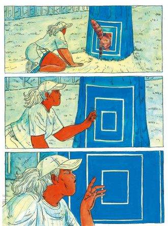 En esta evidente declaración de intenciones, la propuesta estética resulta central para que lo cotidiano se vuelva extraordinario. En la misma línea de sus trabajos anteriores, Mamone se encarga de representar la realidad tal cual es, esto es, bellamente imperfecta. Para esto, le artiste apela a cuerpos completamente alejados de la belleza hegemónica a través de una apuesta visual grotesca y extravagante plagada de tonos complementarios y muy estridentes. Dentro de esta apuesta visual, los tonos anaranjados y azules se volverán prácticamente una constante que acompañarán adecuadamente a las situaciones mágicas, surrealistas y sombrías que experiencia Rebecca, como también a situaciones reales de la vida cotidiana, tales como tomar mate, hablar por teléfono, andar en bicicleta y salir con amigues. La paleta y el trazo resultan pertinentes, puesto que permiten contar una historia única, en la que realidad e irrealidad se solapan para crear una ‘nueva normalidad’ donde transcurren los acontecimientos.