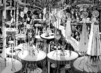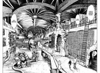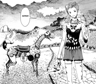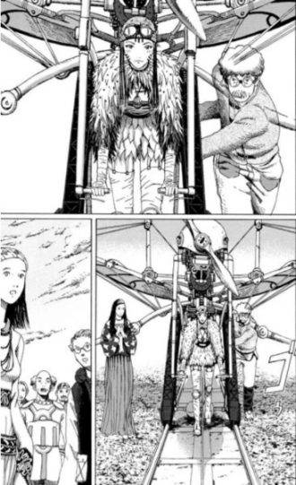 La simbología es obvia: Cada ser es un eslabón, cada persona es un engranaje con una función muy específica. Está todo tan bien dividido, que incluso ese mundo está compuesto por islas, que, oh casualidad, están enfocadas a un solo objetivo. La principal, Pirito, es donde se encuentra la ciudad industrial de Gil. Sus habitantes son los encargados de proveer máquinas y accesorios a las otras islas en intercambio por comida, ropas, etc. Como podrán imaginar, durante la primera mitad, Furuya se dedica a sumergirnos de lleno en el funcionamiento de esta sociedad. Es interesante, porque incluso en un medio como el del manga, no se vuelve algo tedioso ni denso en ningún momento. Es más, llega incluso a tener un aire al de Las Ciudades Invisibles, de Italo Calvino.