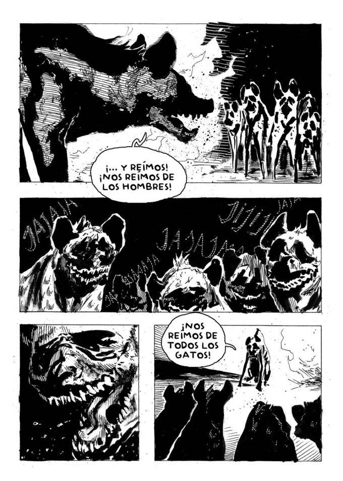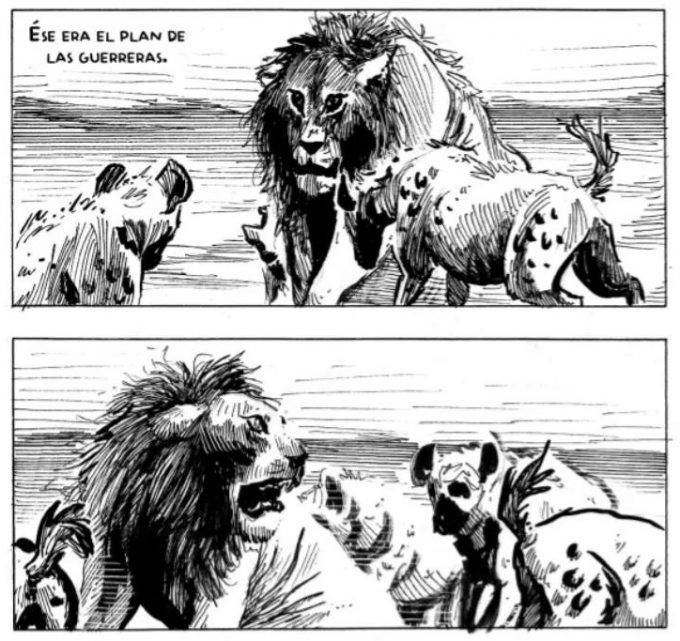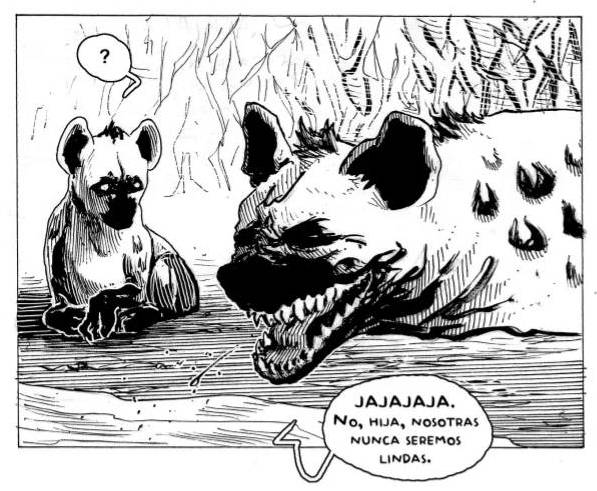 Desde las primeras páginas, Alcatena nos presenta a un grupo de hienas que viven en la sabana y que tienen como antagonistas a quienes ellas llaman ‘los gatos’, esto es, los leones. La hienas enfrentan a esos felinos en sus cacerías y su orgullo como especie nos recuerda que son tan cazadoras como ellos, solo que muchas veces quedan rezagadas como simples carroñeras por su rivalidad natural. A las hienas no les queda más que conformarse con las sobras, con todo aquello que desechan los leones, por lo que, junto con los buitres, pareciera que tienen un ‘papel menor’ en el mundo natural.