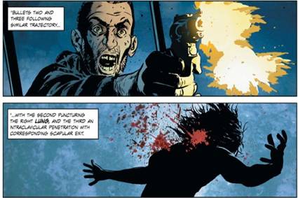 Mientras los diálogos de Rucka te sumergen en la historia, Michael Lark crea mensajes más sutiles a través de las posturas, las expresiones faciales, e incluso la ropa de los personajes. Su exquisito arte de trazos gruesos y oscuros es muy cinematográfico, marcando cada cuadro perfectamente con su impecable uso de tonalidades de negro y haciendo gala de una fluidez increíble, con un gran sentido de la composición. Santi Arcas hace un uso moderado del color entre los intensos tonos de negro y azul; el naranja brillante de un disparo o el rojo intenso de la sangre crean imágenes impactantes y evocativas que le hacen honor a la historia. El uso intencional y calculado del color combinado con las poderosas perspectivas de Lark reflejan desde lo visual la melancolía y crudeza de la historia.