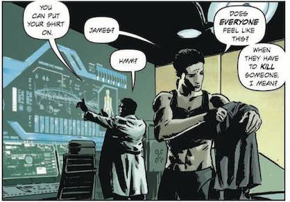 También, a través de sutilezas en los diálogos, Rucka nos otorga de inmediato una mirada hacia el interior de los personajes. Pero Forever, en particular, es un misterio que habrá que develar con el correr de la historia. La semilla del conflicto está presentada desde las primeras páginas; ella es inteligente, físicamente fuerte y actúa con determinación, pero sus motivaciones son externas. Más allá de su obligación de ser el Lázaro de los Carlyle, no queda claro qué es lo que la motiva internamente; pero el ceño fruncido y las miradas profundas indican que hay muchas cosas pasando por su cabeza. Irónicamente, a pesar de ser más un producto de la tecnología que de la naturaleza, en el transcurso de la historia veremos que Forever es la más humana entre los miembros de su familia. Su aislamiento del mundo que la rodea es transmitido a través de las actitudes que los demás tienen hacia ella. Los Carlyle, por ejemplo, no la ven como legítima integrante del clan, sino como una herramienta para ser usada; el patriarca, Malcom, la trata como su hija, pero solamente porque considera que eso la convierte en un mejor Lázaro. Para ellos, su sentimiento de culpa por matar es una debilidad que necesita ser reparada. Por otra parte, tanto los siervos de la familia como los desechos la desprecian por sus privilegios y su apariencia estoica. Aunque estas reacciones hacia ella son comprensibles, su soledad se siente intensa y nos permite involucrarnos más con ella a nivel emocional.