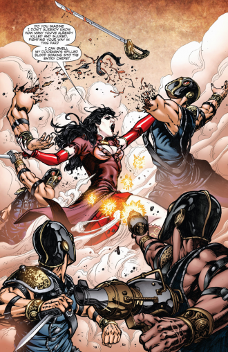 La miniserie se publicó entre 2013 y 2014, y posteriormente hubo algunos spin-offs, entre ellos, una miniserie de Vampirella. Los otros serían dos miniseries de Red Sonja, y una de Green Hornet, pero solamente voy a comentar un poco la de Vampi. La historia retoma desde un momento incierto posterior al final de la miniserie principal, aunque no es continuación directa, y da a entender que pasaron algunas semanas de lo sucedido en aquella. Este spin-off está escrito por David Avallone y dibujado por David T. Cabrera, y ambos son bastante competentes en lo suyo, como para hacer una miniserie al menos, entretenida, aunque no aporta mucho al mundo de Legenderry, ni a Vampirella como personaje.