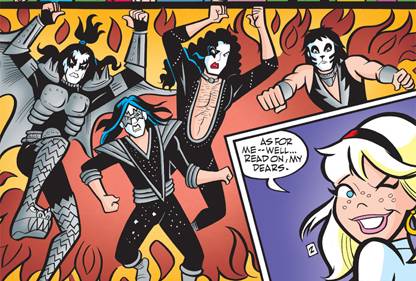 Antes de profundizar un poco más en la historia, nobleza obliga, tengo que admitir que no soy muy fan de Kiss, por lo cual es probable que me pierda algún guiño, alguna referencia y que la presencia de ellos no me sume para buscarle algún puntito extra por onda. Dicho esto, ¡nademos en esta fosa séptica! Todo arranca por una pelea entre Sabrina y Verónica, que termina con la segunda interrumpiendo un ritual y finalizándolo de manera incorrecta, lo que sirve para invocar a cuatro monstruos de otra dimensión (un hombre lobo, una momia, un monstruo de Frankenstein y un vampiro muy en la onda de los de Twilight) que transforman a los habitantes de Riverdale en una especie de zombies por el aburrimiento. Detrás de ellos, por el mismo portal aparecen los miembros de Kiss para detenerlos. Una serie de peripecias pelotudas y malos entendidos hacen que finalmente se resuelva el conflicto gracias a la invaluable participación del cuarteto de las caras pintadas, que solo se presentan por sus nombres de batalla; The Demon, Starchild, Spaceman y Catman, y hacen alarde de tener superpoderes como tirar rayos y escupir fuego.
