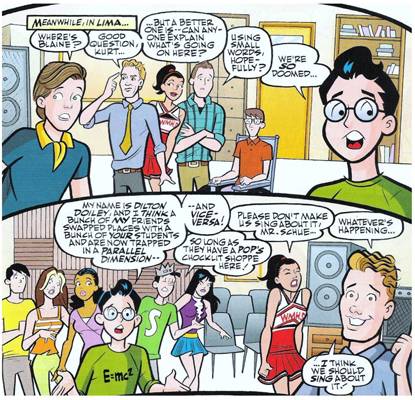 Acá me pasó todo lo contrario que con Kiss: venía super desmotivado por el fiasco que había sido esa historia, y encima un crossover con Glee no me podía importar menos. Pero está tan bien escrito, tan bien resuelto, que me cerró el orto. El laburo que se manda el capo de Roberto Aguirre-Sacasa es demoledor. El tipo había escrito varios episodios de la serie Glee y se nota que la tiene bastante clara con el Archieverse (al punto que de acá se fue a escribir el título Afterlife with Archie). Y ya que hablamos del Archiverse, todo gira en torno a ese concepto tan comiquero como son las tierras paralelas. De esta forma, Dilton -mediante un proyecto de ciencias- abre un portal a otro universo y puede comunicarse con Britanny, que lo considera un amigo imaginario que vive en su locker, y de esta manera hace un paralelo entre buena parte del elenco de Glee y algunos de los más prestigiosos jóvenes de Riverdale. Así es como Finn es el Archie de este otro universo, Rachel es Veronica, el propio Dilton tiene su contrapartida en Artie y asi, resaltando similitudes y tratando de forzar algunas cosas que mucho no cierran pero enfocadas desde el humor, por lo cual las dejamos pasar. Y ya la premisa es tan comiquera,como brillante!! Después, el resto de la historia es un tanto obvia: Dilton piensa viajar al universo de Glee, pero en el momento que está por hacerlo ocurre un accidente que potencia su experimento y hace que la mitad de los personajes de cada universo intercambien lugares. De esta forma, Dilton suma sus fuerzas con Artie en el Gleeverse para tratar de revertir el experimento y devolver a cada quien a su universo, pero se acercan las competencias nacionales y el coro tiene que competir contra los Warblers, al tiempo que los Archies tienen la final del torneo de bandas contra Jossie y las Pussycats. De esta forma, los equipos se rearman para tratar de seguir adelante con las competencias, aceptando cada grupo a los del otro universo, al tiempo que tratan de no hacer nada que afecte el equilibrio de ambos, como que personas de distintos universos ¡se besen!!