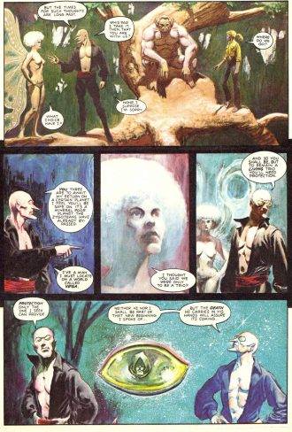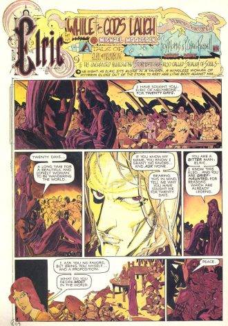 The Dreaming City es, básicamente, el clímax entre el conflicto que enemistó a los primos Elric e Yrkoon, el actual rey de la “Dreaming City”, Imrryr. Si bien esta es la primera aparición de Elric, cronológicamente se ubica más adelante (es parte de la tercera saga del personaje, The Weird of the White Wolf. While the Gods Laugh es secuela inmediata de esta obra), lo cual resulta algo confuso al momento de su primera lectura, si no se conoce nada sobre el universo de Moorcock. Una historia donde Russell deja la vida para ilustrar las habilidades mágicas del albino errante con una maestría inusitada: los diseños del reino de Imrryr, las imágenes pesadillescas que se presentan en el combate final, esta historia sencilla (un exiliado pelea contra aquel que lo exilió) está pensada para el lucimiento absoluto del dibujo. Por el lado de While the Gods Laugh, donde se repite la dupla artística, Elric se adentra en la búsqueda de un libro perdido. Al ser una continuación de la obra anterior, se explora más en los sentimientos turbados del personaje principal, después de los acontecimientos en la ciudad de los sueños. A diferencia de Conan, Elric es un héroe al que el triunfo se le escapa todo el tiempo de las manos, las resoluciones son todas amargas, sin un sentimiento de victoria absoluta.