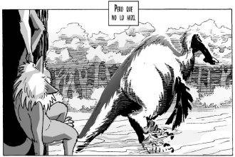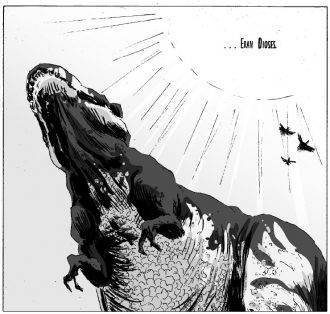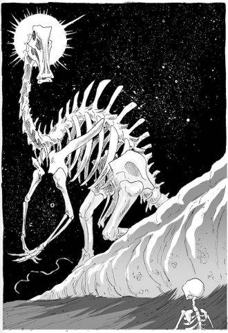 A través de una estética relativamente simple pero con trazo repleto de expresividad y de una intensidad que exceden al plano, Alcatena logra jugar exitosamente con la acromía, lo que habilita al lector y a la lectora viñeta a viñeta, a emocionarse con lo que le acontece a Raro en su viaje casi lisérgico. La escala de grises no limita en ningún sentido a la autora, quien no solo nos representa la típica selva o jungla a la que evocamos cuando imaginamos aquel tiempo en que vivían los dinosaurios, sino una multiplicidad de paisajes que van desde el entorno subacuático y grandes tierras inundadas, a un desolado y desértico cementerio de animales en el medio de la noche y bajo la luz de las estrellas. Dentro del universo que crea Alcatena, sin dudas, el juego que se abre entre la inmensidad y la nimiedad resulta determinante, lo que resulta en una vía pertinente para comprender la manera en que Raro se relaciona con Manos Horribles y percibe desde su entorno más próximo al mundo.