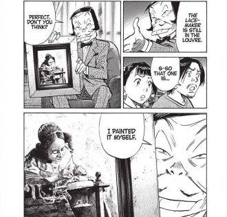Mas luego, es una obra corta. Un solo tomo y 9 capítulos. Es decir, a diferencia de lo que estamos acostumbrados, Urasawa no dispone del tiempo y el ritmo para desarrollar personajes, tramas y subtramas. Esto claramente está atado al pedido del Louvre, ya que el concepto fundamental detrás del encargo, es realizar una obra corta y autoconclusiva con el museo como escenario.