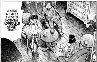 En lo que se refiere a la trama, podríamos simplemente resumir que se trata de la historia de una familia con problemas de dinero, que acude a medidas extraordinarias para poder salvarse financieramente. Esta premisa básica sirve para enmascarar un tema un poco más profundo: los sueños no cumplidos. Cada uno de los personajes -de manera consciente o no- empujará hacia adelante esta historia a la cual no le sobran giros y sorpresas. La historia comienza en las calles de Japón para rápidamente trasladarse a la capital francesa, donde se producirá el rimbombante desenlace. Si bien es cierto que la resolución se da por un Deux Machina bastante poco coherente con la línea de la obra, no por ello deja de ser una historia atrapante y emotiva, con personajes poco desarrollados pero con la profundidad necesaria para encariñarse con los mismos.