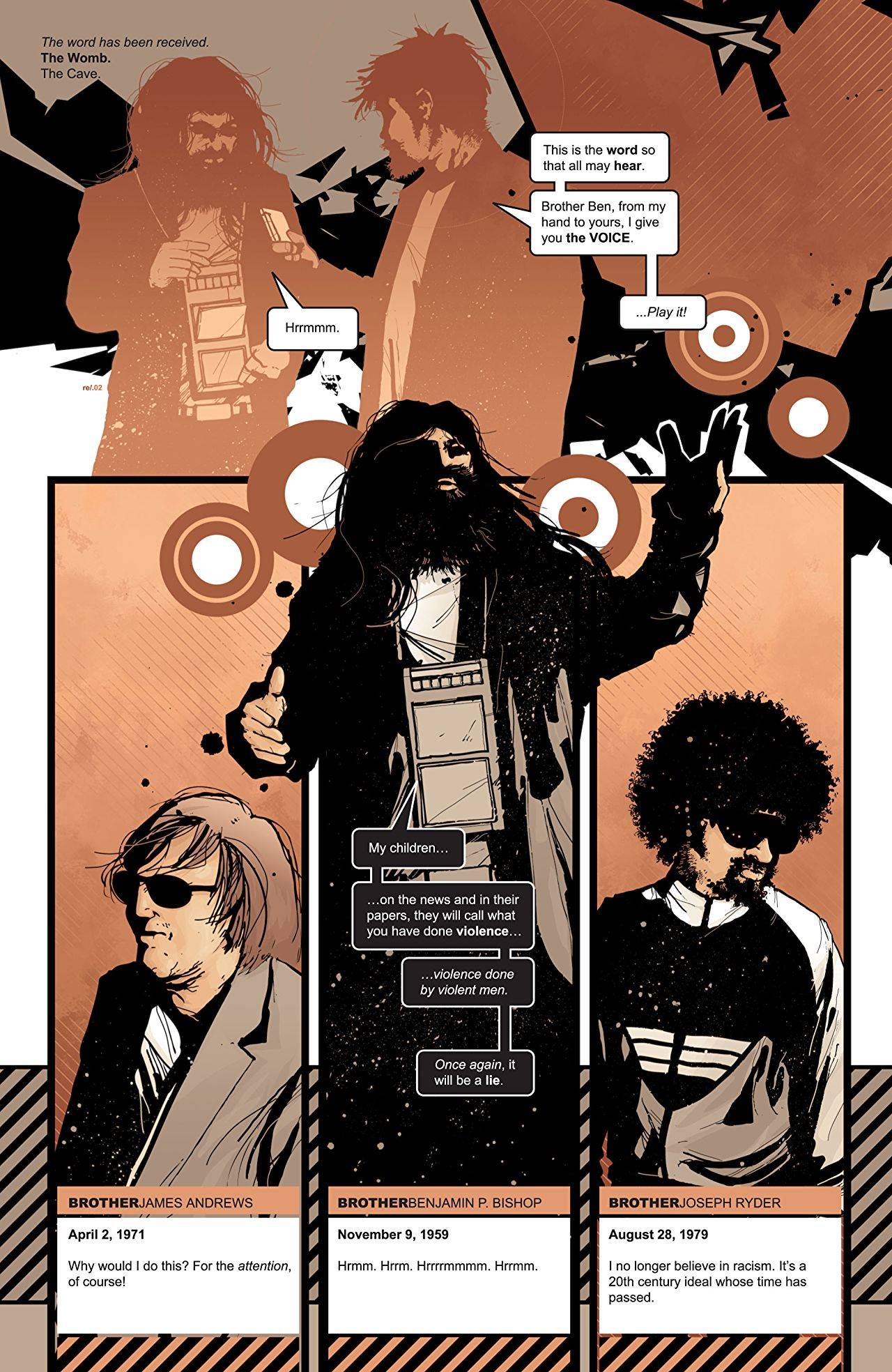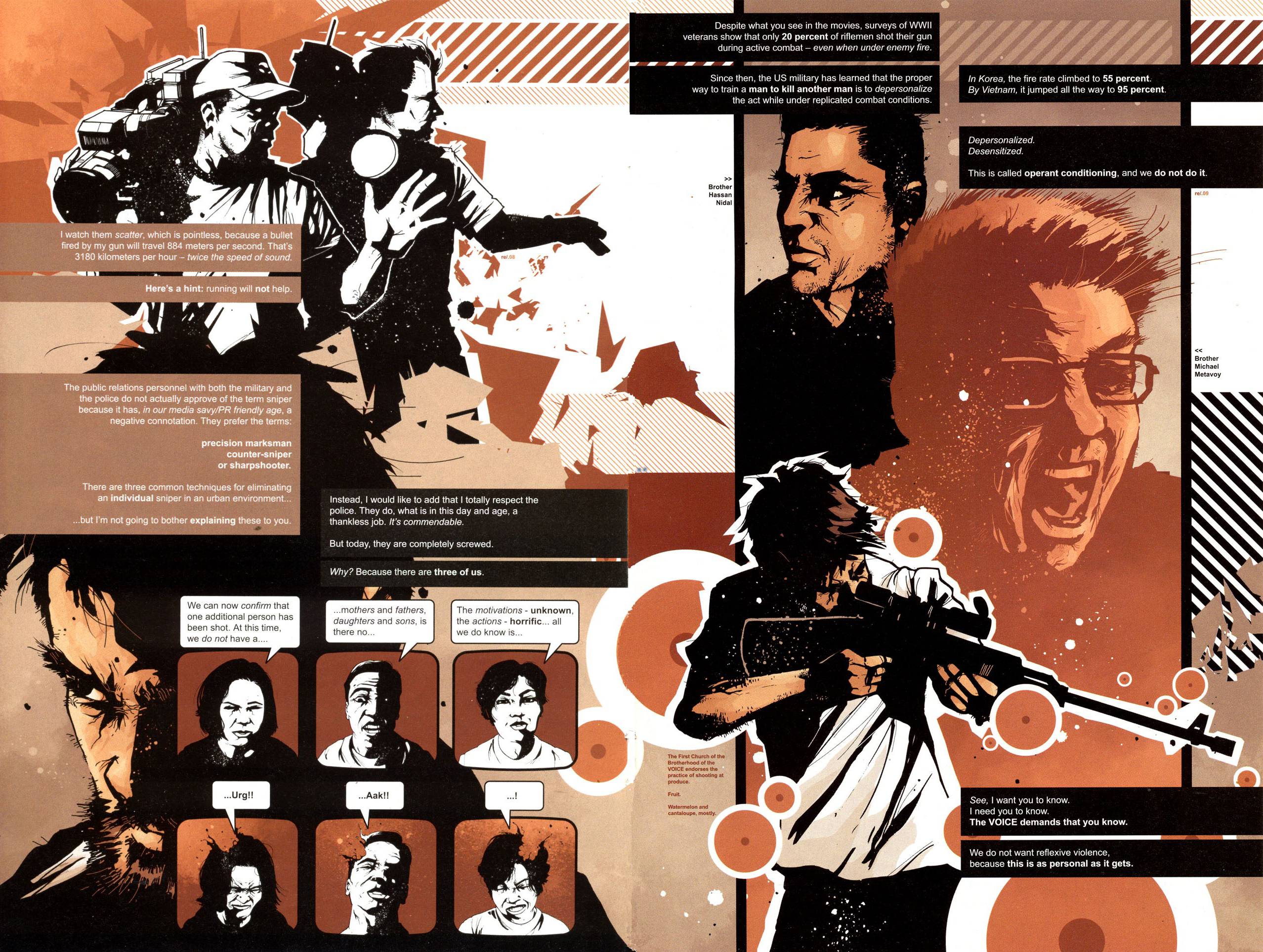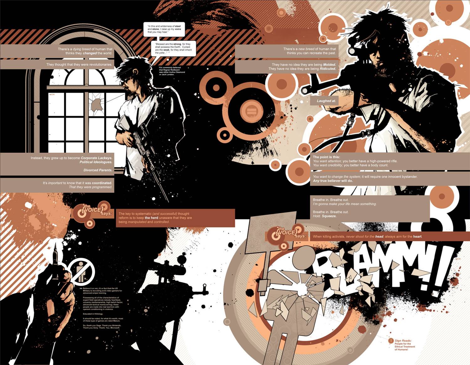 El comic no solo cuenta una historia tradicional, sino que Hickman aprovecha su rol de hombre orquesta (es el guionista, dibujante, letrista, colorista e incluso editor) para disponer la página de acuerdo a los dibujos y a los bloques de información que, si bien no aportan al desarrollo de lo que se quiere contar, sí me parece que ayudan a dar marco, a entender mejor por qué The Voice hace lo que hace, además de parecer por momentos una justificación a los hechos terroristas. Hickman debió pensar lo mismo, porque en cada número hay una aclaración de que como autor no se siente para nada identificado con las acciones de los personajes, algo que se disimula bastante bien, debo agregar. Esos datos, que implican una concienzuda investigación (ni idea si son reales, pero aparecen con una seguridad tan grande, que realmente me convenció) marcan un paralelismo entre las acciones de los terroristas con las de los medios de comunicación, quienes también arruinan vidas con noticias falsas y exageraciones que solo sirven para vender más.