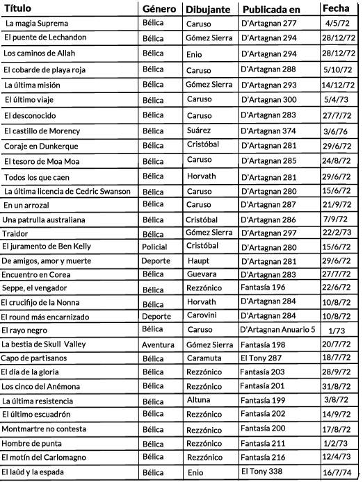 - Primer Capítulo: Morir Así (18/4/74). Publicado en: El Tony nº342 (9/74). Extensión: 35 episodios. Dibujantes: Enrique Villagrán (1-24, 27 con Zaffino), Miguel Angel Verón (25-26, 28-35).