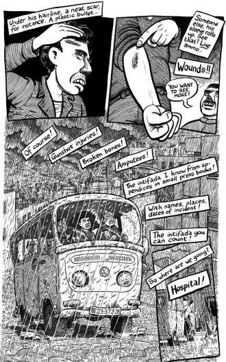 Tras unos primeros pasos en la capital de Israel, Joe comienza su epopeya en los pueblos y las ciudades de Cis-Jordania. Así, seremos testigos a través de sus ojos de la violencia a la cual es sometido el pueblo palestino. Violencia que no solo se ve reflejada en vivir en zonas controladas por las fuerzas militares de Israel, sino a la ocupación de tierras, la creación de campos de refugiados, asentamientos, torturas, asesinatos y otras tantas vejaciones. Con el pasar de las páginas y de los testimonios, es muy interesante ver cómo evoluciona la visión de Sacco, no solo sobre el conflicto sino sobre los dos pueblos. Inicialmente se observaba un claro sesgo anti-árabe en sus historias, probablemente debido a una influencia de su infancia y adolescencia en Occidente. Sin embargo, este comienza a desaparecer de sus historias, y dejará lugar para reflejar a los humanos detrás de esa fachada para turistas que tanto lo ahuyentaba.