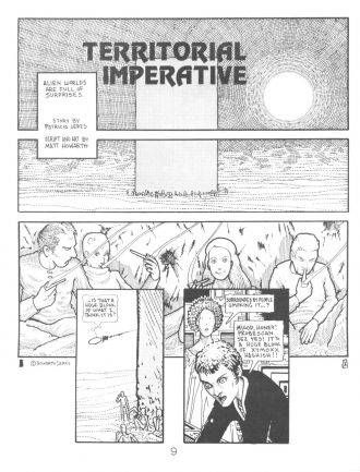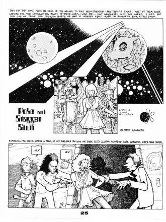Hasta ahora venimos con dos vertientes antológicas: por un lado están aquellos que, como Robert Crumb y su discípulo Peter Bagge, eligen contar historias de corte costumbrista, capaz con ribetes de delirio o exageración pero con una base es más mundana; y por el otro lado están Jim Woodring y Daniel Clowes, adalides del surrealismo. Un buen número de antologías que se vendrán, adelanto, estarán agrupadas en algunas de estas dos variables, pero como bien dice la frase, la excepción hace la regla. La breve antología de hoy trae consigo una tercera posición: la ciencia-ficción. No lo parece tanto o más bien no figura de una manera tan presente como otras influencias, pero la Heavy Metal le rompió la cabeza a muchos fanzineros gringos que pocos años después harían sus primeras armas con estas antologías que vengo reseñando. El ejemplo más claro (Y el que más rápido pasó al olvido) es el de los primeros números de Love and Rockets, donde los Bros Hernández metieron varias historias cortas de corte sci-fi (y de hecho, el primer libro de Locas es más heavymetalero que la obra cumbre del costumbrismo punk que recordamos, ese lastre se lo sacaría tiempo después). Que después se hayan decantado en hacer lo que más recordamos, es otra cosa, pero esta forma adulta de retratar la ciencia-ficción es parte de la génesis de nuevos autores en los ´80 y en Estados Unidos. Ahora, el que sí sostiene esa bandera y no la bajó nunca es Matt Howarth.