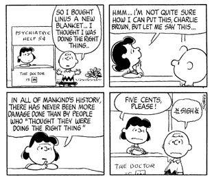 Detrás de un puesto de limonadas con el cartel CONSULTORIO PSIQUIATRICO, una nena escucha los problemas de otra. “Mi problema es que le tengo miedo al jardín de infantes. ¡Ni siquiera sé por qué! Trato de razonarlo, pero no puedo”. A lo que la joven psiquiatra contesta, “No eres diferente del resto. Cinco centavos, por favor.”