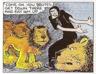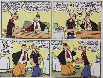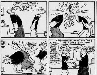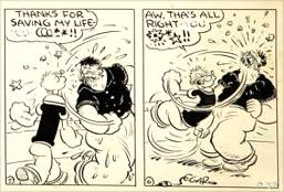 Porque esa es otra de las grandes bazas del Popeye de Segar: es una máquina de pelear y un tipo al que nada lo detiene. Ya en su primera historia recibe una cantidad enorme de balazos y sigue peleando como si nada. Como tampoco le preocupa que le pongan por delante tipos enormes. Por el contrario, nada le gusta más que una buena pelea. Y todas ellas son orquestadas de forma magistral por Segar, que puede estirar dos semanas un enfrentamiento sin que el lector pierda el interés en la tira.