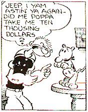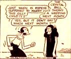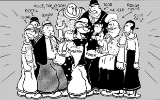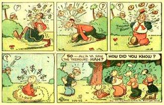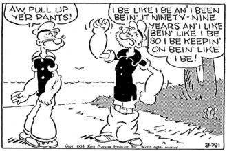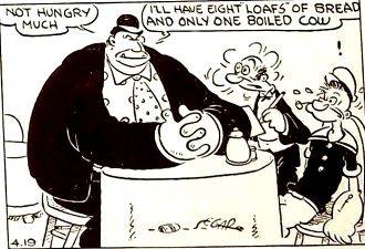 El último gran personaje secundario creado por Segar sería Poopdeck Pappy, el papá de Popeye, que es idéntico a él excepto en que usa barba. Aparentemente, el motivo de su creación tenía que ver con un pedido del King Features Syndicate de que Popeye (a estas alturas uno de sus personajes más populares) fuera más respetable y menos pendenciero. Segar respetaría esto a su modo, al inventar una versión mas jodida de Popeye en la persona de su papá. Que es un tipo de lo peor: mujeriego, ladrón, malhablado y que no tiene empacho en pegarle a las mujeres y. De hecho, al principio ni siquiera quiere reconocer a su hijo, hasta que la sangre tira más y acepta a regañadientes su paternidad.