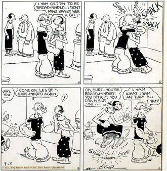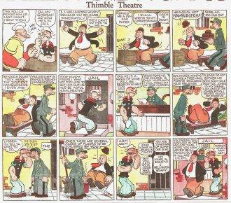 Todos estos personajes aparecen en menos de una década donde Segar parece completamente tocado por el genio. Podríamos delimitar tres tipos de historia que desarrolla Segar en sus aventuras diarias: por un lado las expediciones a lugares extraños para conseguir un tesoro; en segundo lugar las historias donde Popeye termina gobernando o interviniendo en algún país extranjero, que normalmente son una excusa para una sátira política y social descarada (y muy cínica); y en tercer lugar las historias donde el comportamiento honesto aunque poco refinado de Popeye choca con las expectativas sociales, lo que genera comedias de situación muy sólidas. Y en las páginas dominicales (ajenas normalmente a la continuidad de la tira diaria) muy seguido tenemos los intentos de Wimpy para lograr estafar a Roughhouse (el dueño del bar donde normalmente asiste Popeye) o a alguien y conseguir comerse de arriba unas hamburguesas.
