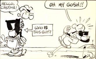El problema era que, quien compraba el sombrero y lo usaba se convertía en un zombie sin voluntad. Popeye lo iba a enfrentar, comía sus espinacas… pero el King of Licensing masticaba dólares y le ganaba a Popeye, que caía al piso, se le caía el gorrito… y ahí pegaba la espinaca. Con su fuerza renovada, vencía al rey y le ponía el gorrito blanco en la cabeza. El rey no solo se volvía un idiota, sino que se convertía en dibujante de historietas.