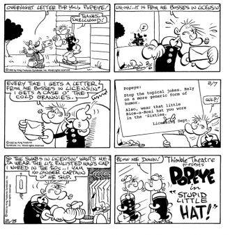 El primer kilombo lo trajo el sombrero de Popeye. Como dijimos, allá por los ´60, se había obligado a Sagendorf a cambiar la gorra original de Popeye por el sombrero de marinero que usaba en los cartoons. Bobby London había retomado la gorra y desde el syndicate le pidieron que volviera al sombrerito de marinero. London respondió con una historia donde el King of Licensing (el Rey de las Licencias) le ordenaba a Popeye usar el sombrerito blanco para poder venderlo.