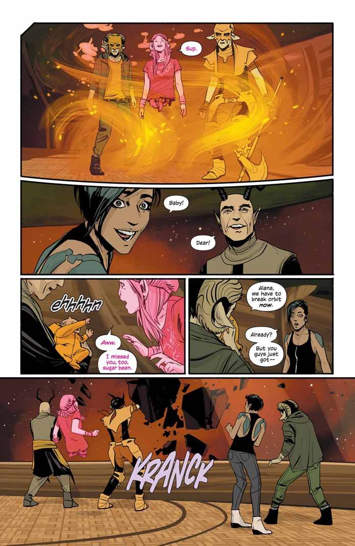 Y hoy hay como una reivindicación de lo cotidiano, algo que no siempre tiene un impacto positivo, y que a mucha gente le hace ruido. Estamos tan acostumbrados a la grandilocuencia que ya la aceptamos como norma, pero por suerte series con el alcance y la calidad de Saga pueden ayudar a revertir esta tendencia. En lo personal, cuanto más parecido hablan los personajes a la gente que uno conoce, más fácil me resulta identificarme, por más que ellos sean guerreros espaciales o miembros de la corona de algún reino fantástico. Este es uno de los motivos que más me atrajo de la serie en sus primeras páginas y que me hizo entrar como un caballo en la dinámica que proponía. Brindo porque así sea.