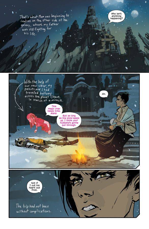 Y como dije "sutileza", no puedo pasar por alto una cuestión que es de mis favoritas en los últimos años, y es cómo el costumbrismo o lo cotidiano, si se prefiere, infectó a la fantasía, desde mi manera de verlo en forma positiva. Para ponerlo más claro, me encanta que un personaje diga “fuck”, o que en el momento de dar a luz, se preocupe porque se va a cagar encima. Todo esto dota a los personajes de un realismo que permite una identificación casi inmediata y deja de lado una cosa pomposa y forzada que era muy habitual en el género fantástico. Por eso la definición que dieron de Saga que es “Star Wars conoce a Game Of thrones” me parece tan acertada.