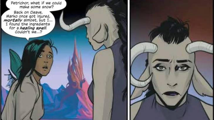 El caso de Petrichor como mujer trans está tratado de manera similar, pero acá la diferencia es que ella es del planeta Wreath, y ahí la gente trans casi que no son consideradas personas, y por eso se ve obligada a ocultar su condición de todo el mundo o sufrir el desprecio absoluto de sus congéneres. La relación que entabla con Klara, la madre de Marko, está muy bien construida, desde el desprecio más absoluto hasta una sincera amistad, en buena medida intervenida por Hazel. Porque ahí está en buena medida el foco de la historia y por qué la niña es peligrosa: porque más allá de ser una persona, engloba una idea, un ideal y el mismo altera a todos con los que se cruza, modificándolos para siempre.