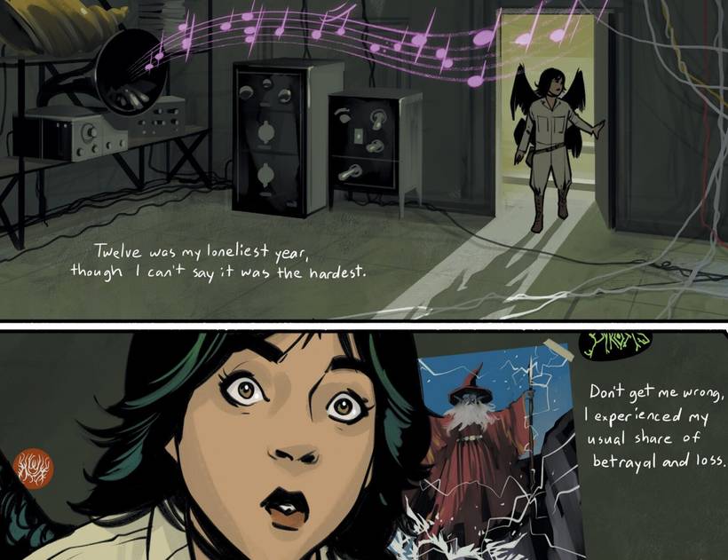 Y ya que mencioné la narración, todas las letras del relato de Hazel son hechas a mano por Staples, y vienen de una idea de darle un aspecto de cuento infantil que tenía Vaughan, ya que en los libros para niños los textos están sueltos en la página, no suelen estar enmarcados en un bloque de texto ni nada parecido. En general hay una ilustración y el texto así, flotando en el aire, si se quiere. Y el guionista quiso volcar este concepto en la historieta y por eso le pidió a la dibujante que las intervenciones de Hazel fueran de esta manera.