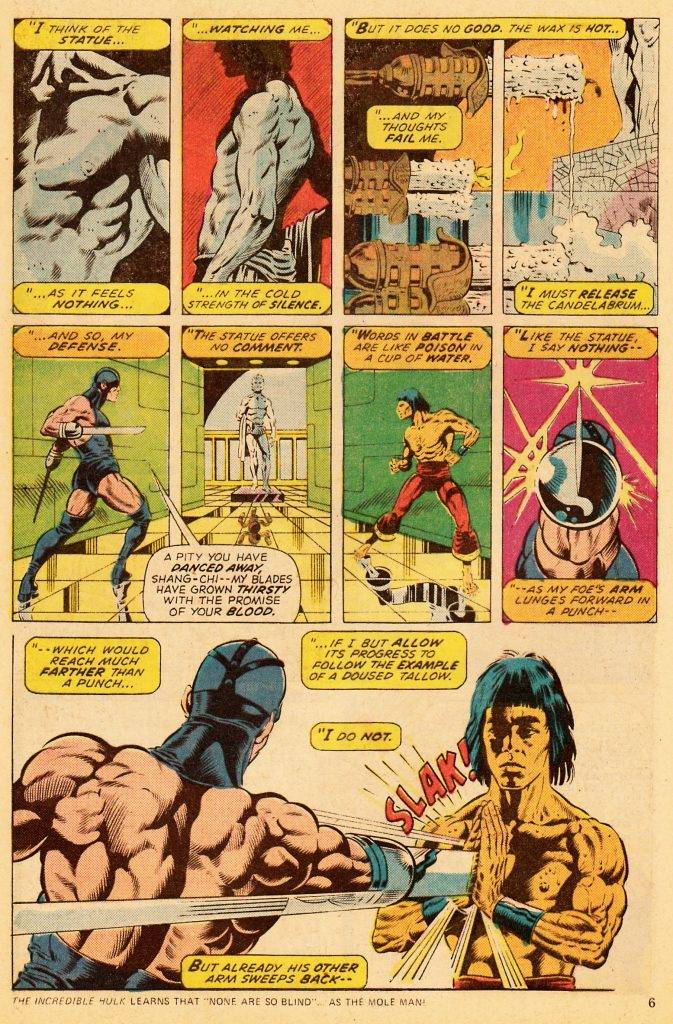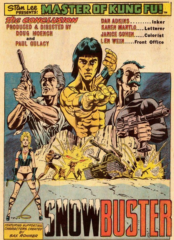 Lo de Moench es realmente sorprendente, porque en ese momento de auge de la serie escribía para la revista en blanco y negro, para el comic mensual a color y para los Giant-Size trimestrales, sin bajar nunca la calidad. Incluso en un momento Master of Kung Fu se empieza a publicar en el Reino Unido, en la revista semanal Avengers, y aunque no ponen un episodio completo por semana, rápidamente se les acaba el material publicado en EEUU. Así es como Moench se tiene que poner a producir (junto al dibujante Ron Wilson) segmentos de ocho páginas nuevos, para mandar a la editorial inglesa y que Shang-Chi no falte en ningún número de la revista Avengers. El guionista nunca tuvo reparos en confesar que el tema de las artes marciales no le interesaba para nada, que no era fan de Bruce Lee ni de la serie Kung Fu, pero lo que le gustaba era poder jugar con este personaje ingenuo, que veía el mundo con ojos de forastero, y al que le podía sumar enemigos y personajes secundarios con mucha libertad, para enroscarlos en una telenovela infinita, con sabor a pulp y sin salir de los confines de lo posible.